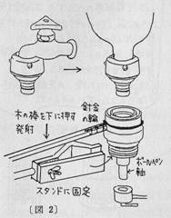 ホームセンターへ行くと,水道の大口径蛇口とホースをワンタッチで脱着できる蛇口ニップル(オス)とコネクター(メス)が市販されています(800円程度)。オスの方を<図2>のようにボトルの口にしっかり取り付けて,メスを発射台に取り付けるのもいいでしょう。この場合,口径が小さくなるので少し加速度が小さくなって本物のロケットのような運動をしますが,大変指向性が悪くなります。ですから,翼(<図3>を参照)を必ずつける必要があります。