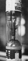 さて,洗濯バサミを取り外すと,ボトルTは水を噴出して減圧していきます。それと共に,ホースも縮み,二段目のロケットの切り離しが終わるわけです。しかしこれだけでは,ボトルTの発射とほとんど同時に二段目のロケットが切り離されてしまいます。そこでバルブPの中に押しピンのプラスチックの玉(φ5mm)を入れてやります。すると,ホースから,ボトルTへ空気の戻りが遅くなり,ボトルTの減圧より少し遅れてホースの内部が減圧し,全体が10〜20mほど上がったところで,二段目の切り離しが起こるようになります。この玉を入れるのは,一段二段全体が一緒になってある程度上昇してから,わずかの時間差をおいて,二段目が切り離されるための決定的部分です。