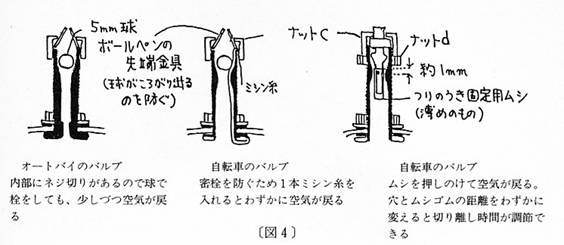 最近,林熙崇さんがこの部分を<図4>のような方法に改良しました。この方法の良さは,釣り用ムシゴムの位置を調整して,どのあたりで切り離しをはかるか,試行錯誤をしながらでも調整できる点でしょう。ただ残念なことは,薄手でかたいゴムが入手しにくい点です。自転車のムシは柔らかいため,すぐ抜けてしまいます。ムシゴムの替わりにテープレコーダーのシールド線のビニル被覆を使うのも一つの方法でしょう。